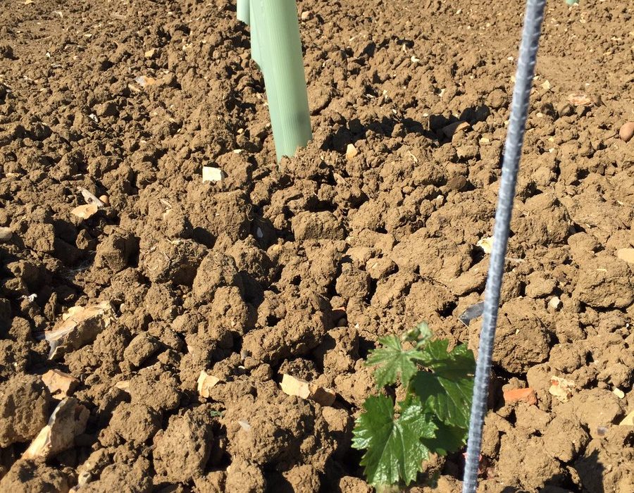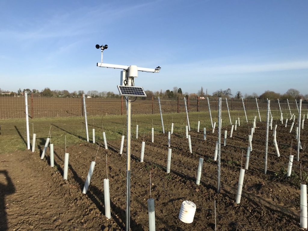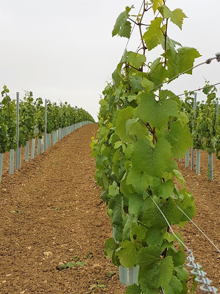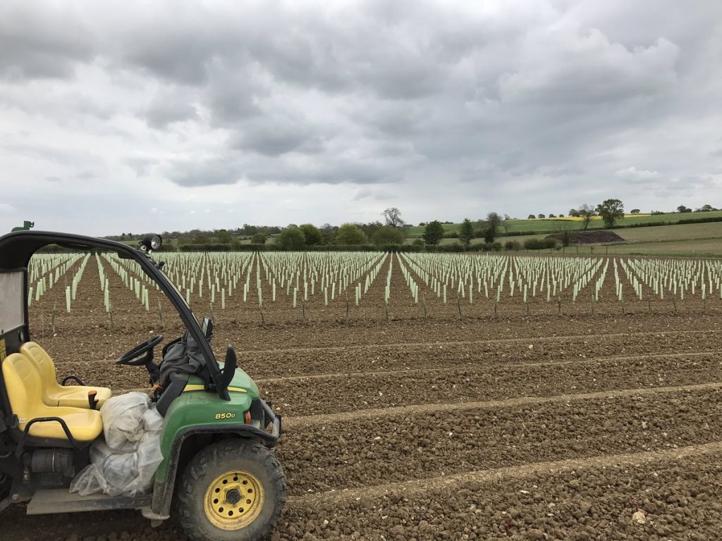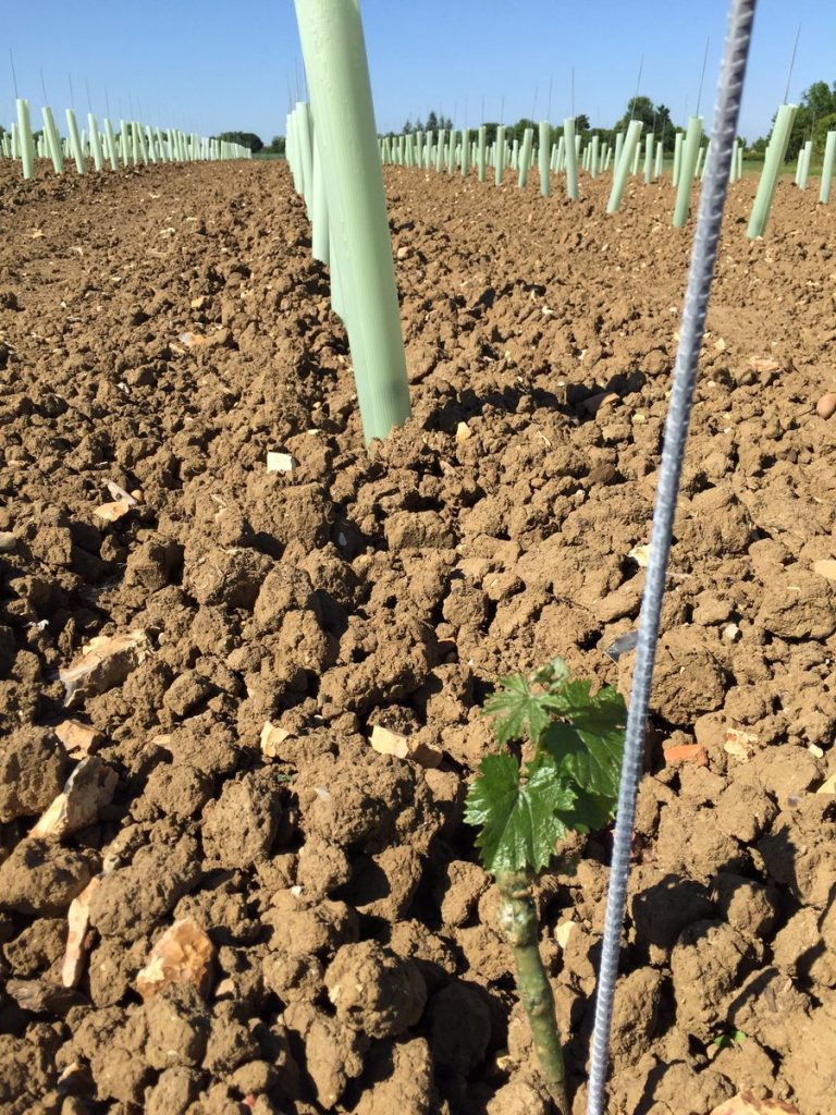Before planting could start though, James needed to ensure the soil was at it’s prime – and this is where Material Change came into play. We provided James with our PAS:100 0-40mm compost which is rich in nutrients. James has used 50 tonnes of compost per hectare in soil preparation and in 4 to 5 years time will add more – cultivating it in around the vines. The planting was carried out using GPS precision guides resulting in laser straight rows of vines in any direction you look. They are planted 1 metre apart with a two metre gap between rows to allow access for machinery. There are two weather stations situated within the vines, giving James up-to-date meteorology information, giving him weather alerts directly to his mobile phone. The farm recently purchased 4 huge ‘Frost’ fans that will sit at the lower end of the field. These will automatically turn on when the temperature drops below 2 degrees C, to move the air around to prevent the frost settling on the vines – this could be catastrophic should the frost settle on the vines. In total, they have planted 46,000 German vines.